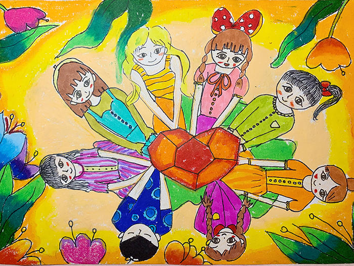 寓意:此畫作創(chuàng)作了我愛我的祖國(guó),祖國(guó)加油!我們是祖國(guó)未來(lái)的花朵,我們是七彩少年,畫中我們共同手捧愛心,那是我親愛的祖國(guó)——中國(guó),我們齊心協(xié)力,眾志成城,我們同在一片藍(lán)天,懷著同一顆熱愛祖國(guó)的心,我們會(huì)用我們勤勞的雙手共建我們美麗富饒的中國(guó),我們都愛我們的祖國(guó),我以祖國(guó)為榮。