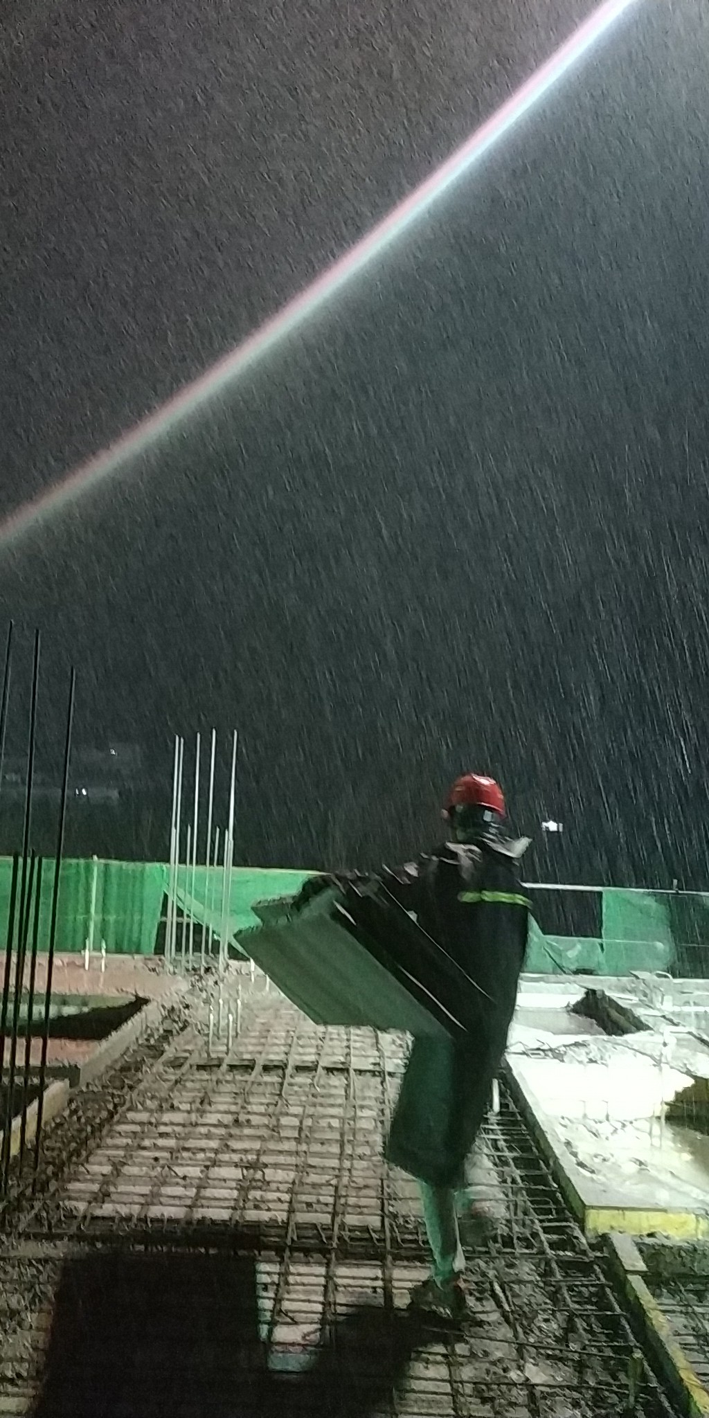 11月7日鎮(zhèn)雄縣第二人民醫(yī)院項目迎來了2018年的第一場雪,這是一個雷電、雨、雪交加的晚上,給人的感覺身處在一個偌大的冰窖里,我窩在被窩里抱著火爐看電視。然而在如此寒冷上廁所都需要勇氣的夜晚,為了確保完成11月30日節(jié)點目標,我們的項目副經(jīng)理成俊、施工員胡杰盛和民工兄弟們,冒著雷雨雪依然堅守在澆筑混凝土的第一線。在寒冷的冬季,如何保證澆筑的混凝土質量是一大難題,在質量總監(jiān)劉榮軍的指導下對混凝土成品采取防凍防寒措施,第一層采用薄膜覆蓋、第二層用土工布鋪蓋、第三層用防水黑棉鋪蓋、第四層用土工布覆蓋壓實,澆筑完后用兩盞三千瓦燈對射覆蓋。
