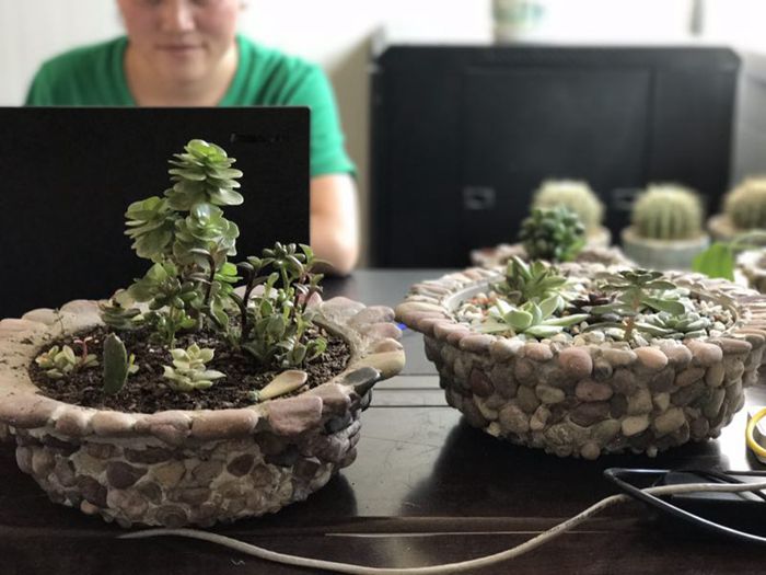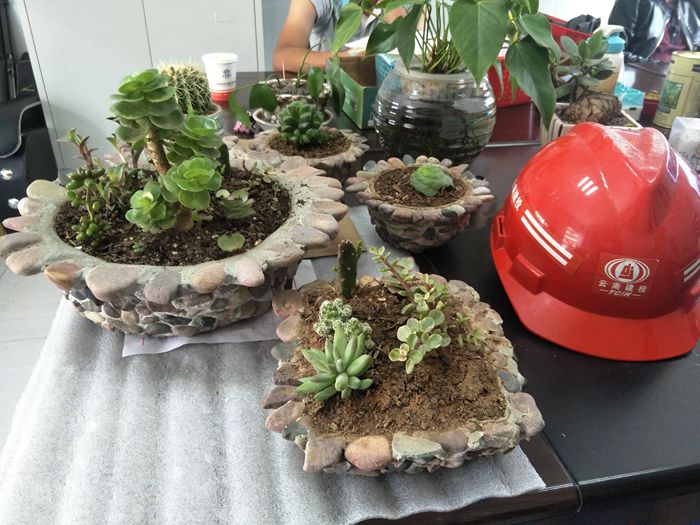 技術(shù)支持: 方森科技 今天晚飯時(shí)經(jīng)過(guò)材料室,無(wú)意間發(fā)現(xiàn)袁老師傅和小尤拿著一桶小石子和小半袋水泥在那搗鼓著什么,仔細(xì)一看,眼前的一幕讓我眼前一亮,只見(jiàn)他們一人拿著小鏟子兌著水?dāng)嚢杷?,一人在塑料盒周圍擺上小石子,不一會(huì)兒的功夫,一個(gè)個(gè)漂亮的小花盆閃亮登場(chǎng)啦。別說(shuō),這用塑料盒、水泥和小石子做出來(lái)的花盆還真是漂亮,再放上泥土,種上多肉植物,擺放在辦公桌上,真是這繁忙的項(xiàng)目駐地處里的“一股清流”啊。細(xì)問(wèn)才知道,原來(lái),這些漂亮花盆的材料都是“原生態(tài)”來(lái)的,塑料盒是吃完洗干凈的塑料飯盒,水泥是他們?cè)谒嘬囆敦浀臅r(shí)候掃下來(lái)的水泥渣,就連小石子也都是從澄江邊上撿回來(lái)的。利用這些材料,袁老師傅和小尤親手“打造”出了辦公室里的一道靚麗的風(fēng)景。