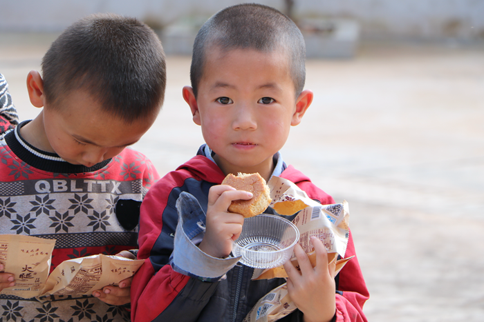 當(dāng)我們把月餅送到孩子們手中時(shí),有的孩子忍不住現(xiàn)場(chǎng)品嘗起美味的月餅來(lái),有的孩子則拿著月餅左瞧瞧、右看看,舍不得吃掉?!靶∨笥?,你怎么不吃呢?”“我要給我妹妹帶回去,媽媽生病了,爸爸在外打工掙錢,我們家沒(méi)買過(guò)這種粑粑吃?!毙∧泻⒚鎸?duì)我們一點(diǎn)也不害羞,而是一本正經(jīng)地講述著自己不吃月餅的“小秘密”。