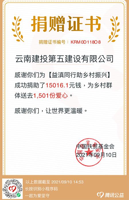 9月10日下午2點(diǎn),一張捐贈證書新鮮出爐。公司787名黨員、干部、職工及家屬,僅用一天時間,為“益滇同行助力鄉(xiāng)村振興”活動籌集善款共計15016.1元,在云南建投集團(tuán)募捐榜位列第二。