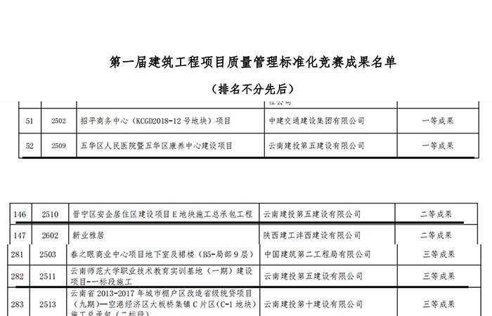 近日,中國建筑業(yè)協(xié)會質(zhì)量管理與監(jiān)督檢測分會公布了第一屆建筑工程項(xiàng)目質(zhì)量管理標(biāo)準(zhǔn)化競賽的成果名單。公司參評的五華區(qū)人民醫(yī)院暨五華區(qū)康養(yǎng)中心建設(shè)項(xiàng)目獲一等成果、晉寧區(qū)安企居住區(qū)建設(shè)項(xiàng)目E地塊施工總承包工程獲二等成果,云南師范大學(xué)職業(yè)技術(shù)教育實(shí)訓(xùn)基地(一期)建設(shè)項(xiàng)目-一標(biāo)段施工獲三等成果。