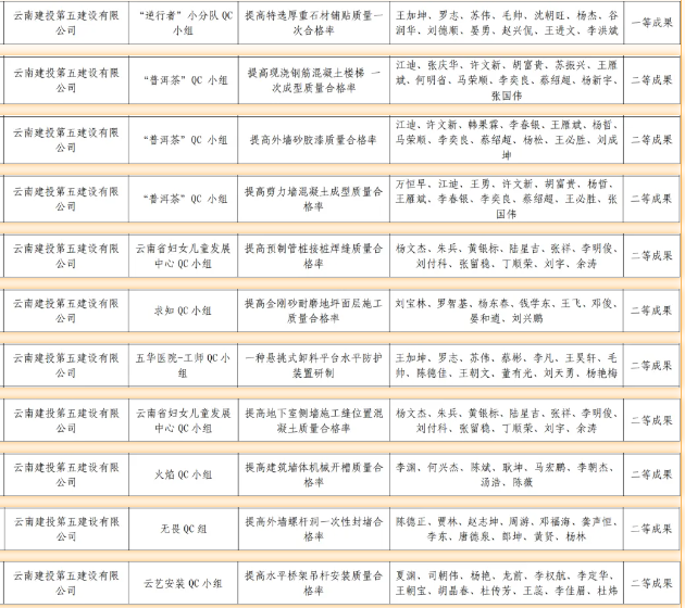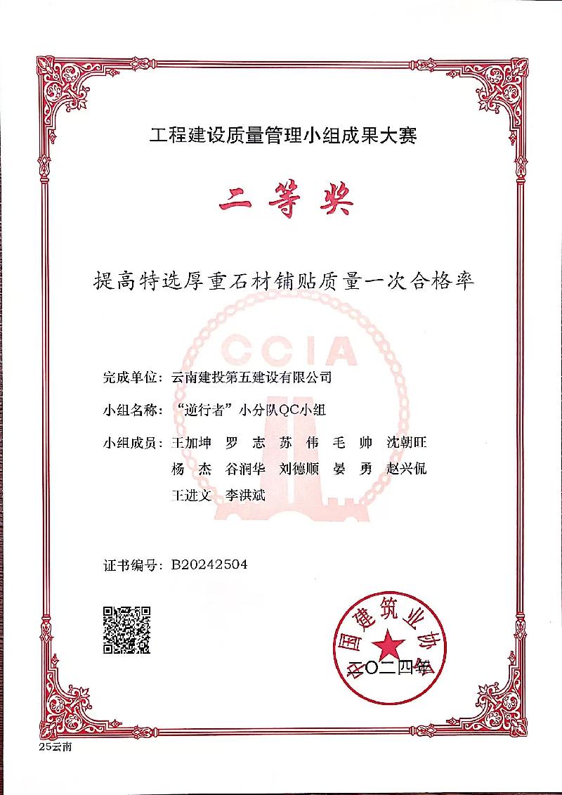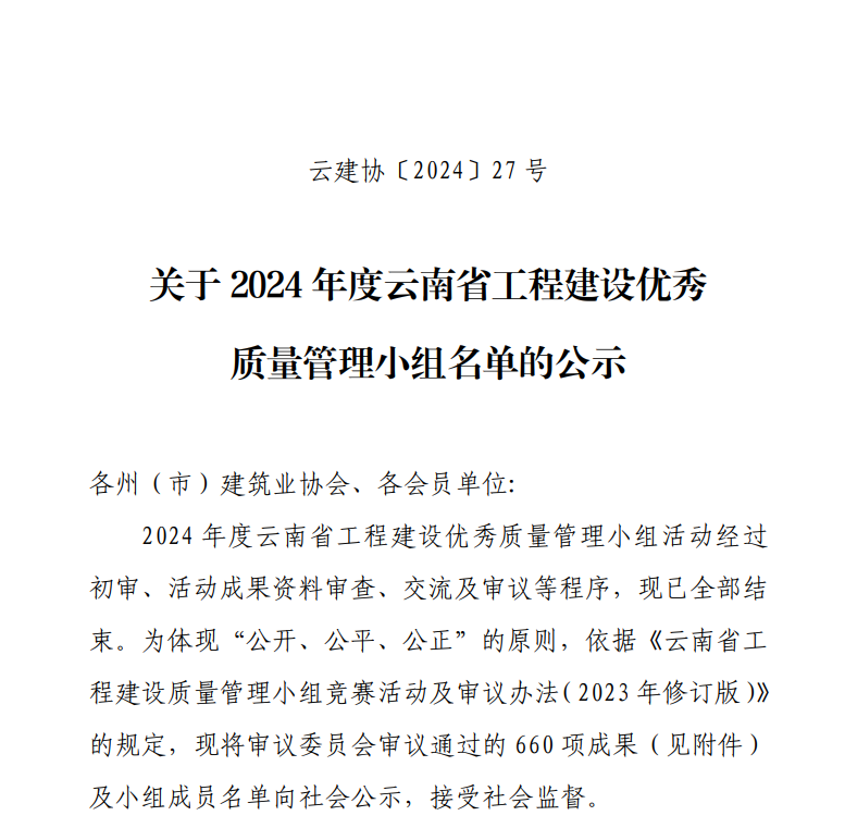近日,昆明市建筑業(yè)協會、云南省建筑業(yè)協會及中國建筑業(yè)協會相繼頒發(fā)了2024年度工程建設質量管理小組活動成果,公司憑借精細化的過程質量管理和精益求精的品質管理,榮獲2024年度中國建筑業(yè)協會工程建設質量管理小組成果二等獎1項、云南省工程建設優(yōu)秀質量管理小組成果11項、昆明市工程建設優(yōu)秀質量管理小組成果4項,獲評昆明市建筑業(yè)協會“質量管理優(yōu)秀企業(yè)”榮譽稱號。