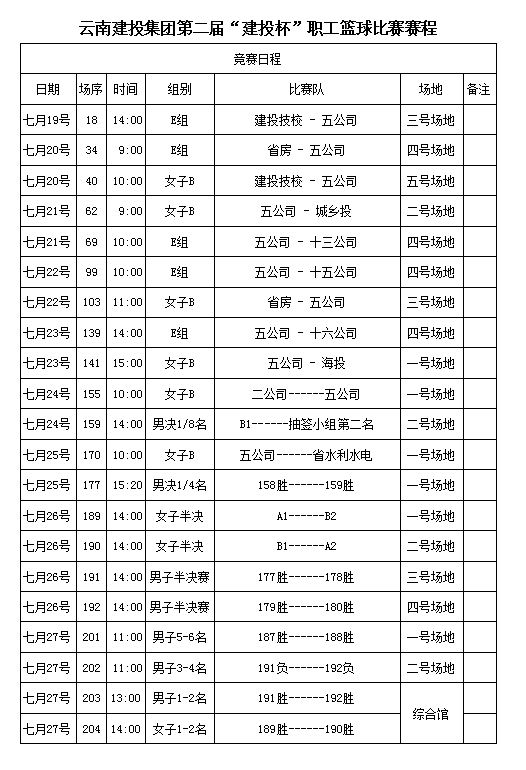 • 7月19日,集團(tuán)第二屆“建投杯”職工籃球賽在昆明理工大學(xué)呈貢校區(qū)體育教學(xué)樓開賽。在下午2點(diǎn)舉行的男子E組比賽中,公司男隊(duì)以104比39的比分戰(zhàn)勝建投技校代表隊(duì),首戰(zhàn)告捷。