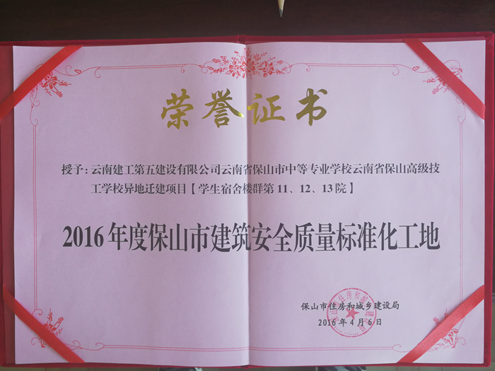 技術(shù)支持: 方森科技 4月5日,由第四直管項(xiàng)目部施工的保山中等專業(yè)學(xué)校(保山高級(jí)技工學(xué)校)異地遷建項(xiàng)目(學(xué)生宿舍樓群第11、12、13院)被保山市住房和城鄉(xiāng)建設(shè)局評(píng)為“2016年度保山市建筑安全質(zhì)量標(biāo)準(zhǔn)化工地”。