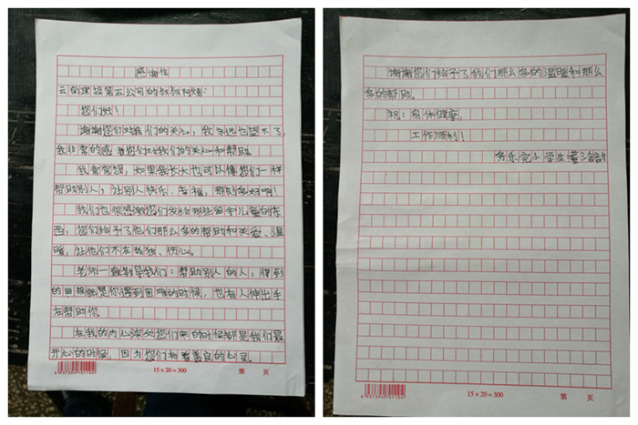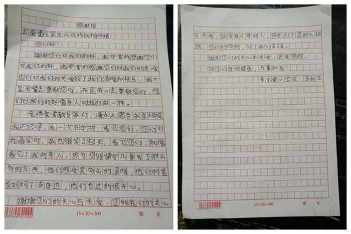 活動結(jié)束后,兩名小朋友委托集團(tuán)扶貧工作隊(duì)給公司寄來了感謝信。青年職工們表示在這樣的實(shí)踐活動中不僅學(xué)習(xí)了雷鋒精神還感受到了企業(yè)的責(zé)任與擔(dān)當(dāng)。