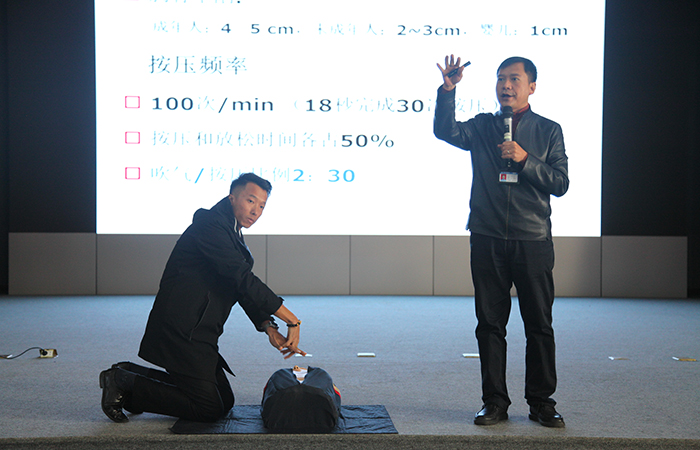 “工作時(shí),遇到突發(fā)中暑、外傷的情況如何急救?”“游泳時(shí),遇到溺水突發(fā)情況如何自救互救?”武宏宇利用PPT,結(jié)合生動(dòng)實(shí)例,將可能會(huì)遇到的突發(fā)事件及有效急救措施向大家進(jìn)行介紹,并重點(diǎn)講解了 “心肺復(fù)蘇”、“人工呼吸”、“猝死”等常用的急救知識(shí)和技能。