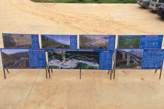 該效果圖展板包括標(biāo)段總平面圖、標(biāo)段內(nèi)控制性工程古那灣連續(xù)剛構(gòu)橋、松園橋互通立交及連接線、古那灣2號隧道及忠義3號大橋、兩家村1號大橋、兩家村2號大橋、兩家村3號大橋共計(jì)7幅。