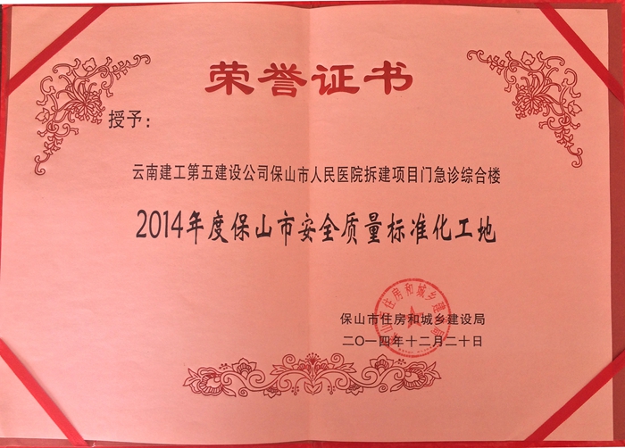 •     3月27日,保山市住建局組織召開全市建筑業(yè)管理暨工程質(zhì)量安全監(jiān)管工作會(huì)議,對(duì)2014年度在工程質(zhì)量安全監(jiān)管工作上取得優(yōu)異成績(jī)的單位進(jìn)行表彰。其中,由公司第四直管項(xiàng)目部施工的保山市人民醫(yī)院遷建項(xiàng)目被授予“2014年度保山市安全質(zhì)量標(biāo)準(zhǔn)化工地”榮譽(yù)稱號(hào)。