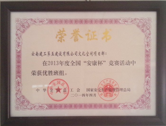 •     6月18日,中華全國總工會和國家安全生產(chǎn)監(jiān)督管理總局聯(lián)合在北京召開2013年度全國“安康杯”競賽表彰暨經(jīng)驗交流電視電話會議,會上,中華全國總工會、國家安全生產(chǎn)監(jiān)督管理總局發(fā)布總工發(fā)〔2014〕19號《關(guān)于表彰2013年度全國“安康杯”競賽先進(jìn)集體和優(yōu)秀個人的決定》,公司第四直管項目部文化空間項目部榮獲2013年度“全國安康杯競賽優(yōu)勝班組”稱號。