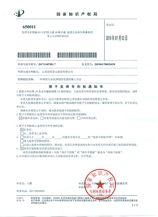 技術(shù)支持: 方森科技近日,公司《一種鋼管與水泥預(yù)制管連接的施工方法》與《一種鋼管與玻璃鋼夾砂管連接的施工方法》兩項(xiàng)技術(shù)成果榮獲國家發(fā)明專利授權(quán)。