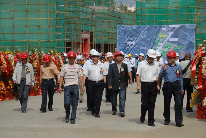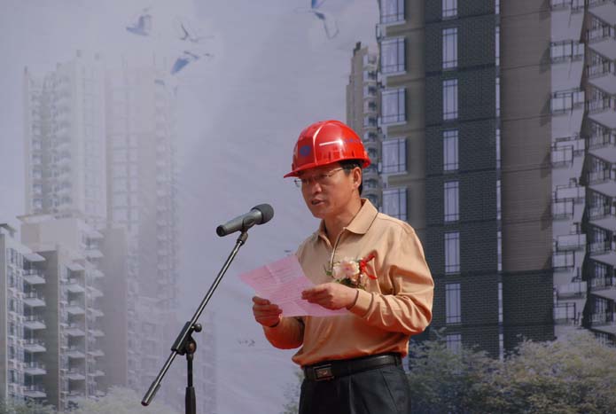 由于場地狹窄,起初塔吊、雙籠吊及鋼筋場的布置極為困難。另外,麗水雅苑工程屬于典式住宅,轉(zhuǎn)角較多,外懸挑架在立面立桿和橫桿的設(shè)置過程中也遇到困難。尤其14棟開工比其它棟號晚,地下一層,地上三十三層,又是麗水雅苑最高的四棟高層之一,卻要求與整個項(xiàng)目同時封頂。有壓力才有動力,五建公司始終本著對建設(shè)單位負(fù)責(zé)的原則,充分發(fā)揮面對困難、敢于亮劍的拼搏精神,在工期緊、異型結(jié)構(gòu)難度大的情況下,項(xiàng)目部始終堅(jiān)信辦法總比困難多,找新辦法,克服新困難,工作抓重點(diǎn)、抓難點(diǎn)、發(fā)現(xiàn)問題及時有效落實(shí)到位,努力做到“四要”(即節(jié)奏要快、標(biāo)準(zhǔn)要高、態(tài)度要好、工作要踏實(shí))、“三不”(即工作等不起、慢不得、坐不?。?。通過嚴(yán)格管理和有效的激勵措施,終于迎來了麗水雅苑項(xiàng)目于2010年5月27日勝利封頂,集團(tuán)公司黨委副書記、紀(jì)委書記張戰(zhàn)國親自到場祝賀,參加了封頂儀式,五建公司總經(jīng)理方菊明代表施工單位發(fā)言,公司總工程師焦倫杰等出席了封頂儀式。