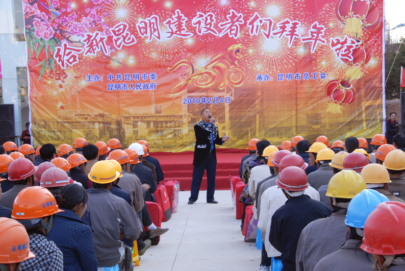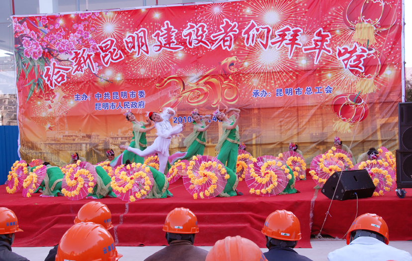 2月4日上午,受昆明市委、市政府委托,昆明市總工會主席楊麗等領(lǐng)導(dǎo)同志率團到云南建工第五建設(shè)有限公司昆明工人文化宮建設(shè)工地,給包括農(nóng)民工在內(nèi)的新昆明建設(shè)者拜年,給建設(shè)者送來新春的祝福和溫暖的禮品。楊麗主席和工會干部以及昆明市楓葉職工藝術(shù)團的演員們分別獻上精彩的歌舞。