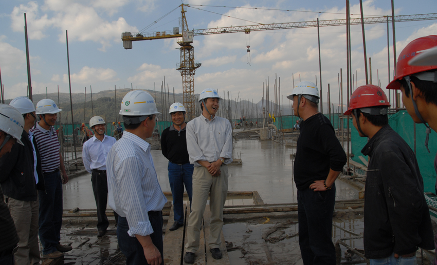 在即將封頂?shù)募瘓F景秀西苑經(jīng)濟適用房工程四標段第六棟號工地,納董事長一行和五建及省房領導一起,放棄乘電梯,從一樓步行到二十八樓頂層作業(yè)面,逐層查看了現(xiàn)場施工管理情況,向兼任五公司景秀西苑經(jīng)濟適用房工程項目管理部經(jīng)理的五建紀委書記謝海健和四標段項目經(jīng)理李云華等了解了工程施工管理情況。