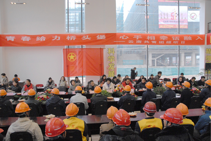 技術(shù)支持: 方森科技 2011年1月16日下午,共青團(tuán)云南省委邀請(qǐng)部分省人大代表、省政協(xié)委員、昆明市12355青少年服務(wù)臺(tái),青少年事務(wù)教授、專(zhuān)家、律師到公司承建的昆明市工人文化宮遷建項(xiàng)目工地開(kāi)展主題為“青春給力橋頭堡 心手相牽話(huà)融入”的“云南共青團(tuán)傾聽(tīng)日”活動(dòng),傾聽(tīng)現(xiàn)場(chǎng)青年的心聲。共青團(tuán)云南省委書(shū)記、省人大常委饒南湖,集團(tuán)公司副總經(jīng)理?xiàng)顫h委委員、黨委工作部部長(zhǎng)陳發(fā)強(qiáng),團(tuán)委副書(shū)記雷棲,公司副總經(jīng)理李興奎出席活動(dòng)并與青年們座談。團(tuán)省委權(quán)益部部長(zhǎng)吳琳、楊濤在座談會(huì)上發(fā)言。座談會(huì)由共青團(tuán)云南省委副書(shū)記楊金瑩主持。