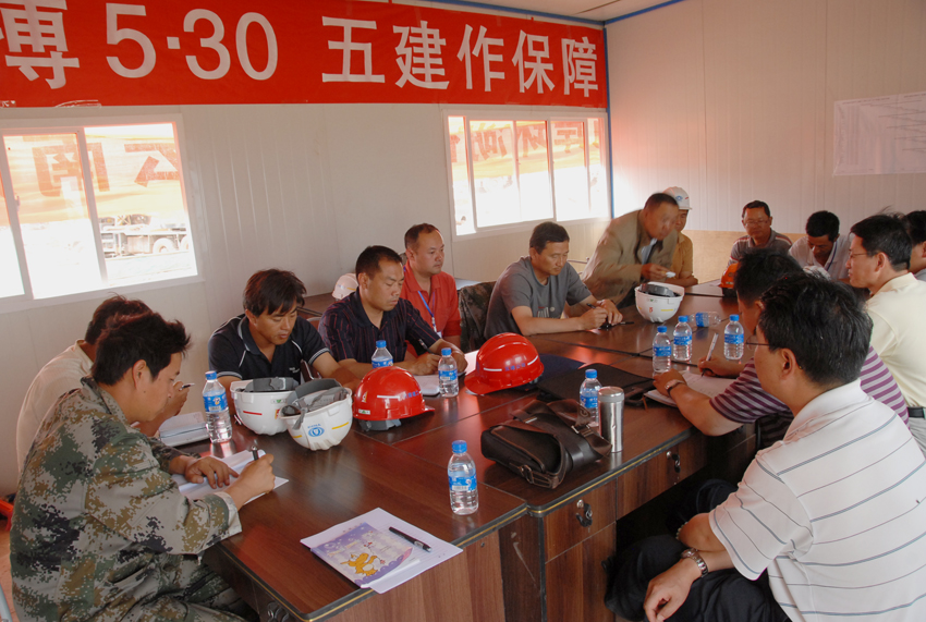 公司副總經(jīng)理兼第三直管部經(jīng)理段培勇介紹了工程施工組織管理情況。該工程的工期十分緊張,從4月6日根據(jù)建工集團要求緊急進場增援施工以來,五建公司第三直管部、五建市政工程公司以及近日進場的503直管部一直晝夜施工,連續(xù)奮戰(zhàn),沒有休過一天的節(jié)假日。工程場地非常狹窄,幾乎天天都要為尋找堆土場地費盡心思,還要花費大量精力協(xié)調(diào)與當(dāng)?shù)卮迕竦年P(guān)系。在整個工程施工中,不僅與集團內(nèi)兄弟單位展開無形中的勞動競賽,而且還要與國字號的專業(yè)隊伍同臺競技。參建同志決心為公司和集團榮譽全力一搏,以優(yōu)秀的建設(shè)業(yè)績報答上級的信任。針對施工現(xiàn)場地處低洼排水不暢、淤積泥土極其松軟的地質(zhì)條件,提出了分工合作、協(xié)同作戰(zhàn),搶在雨天到來之前全力拼搏搶進度的工作思路。