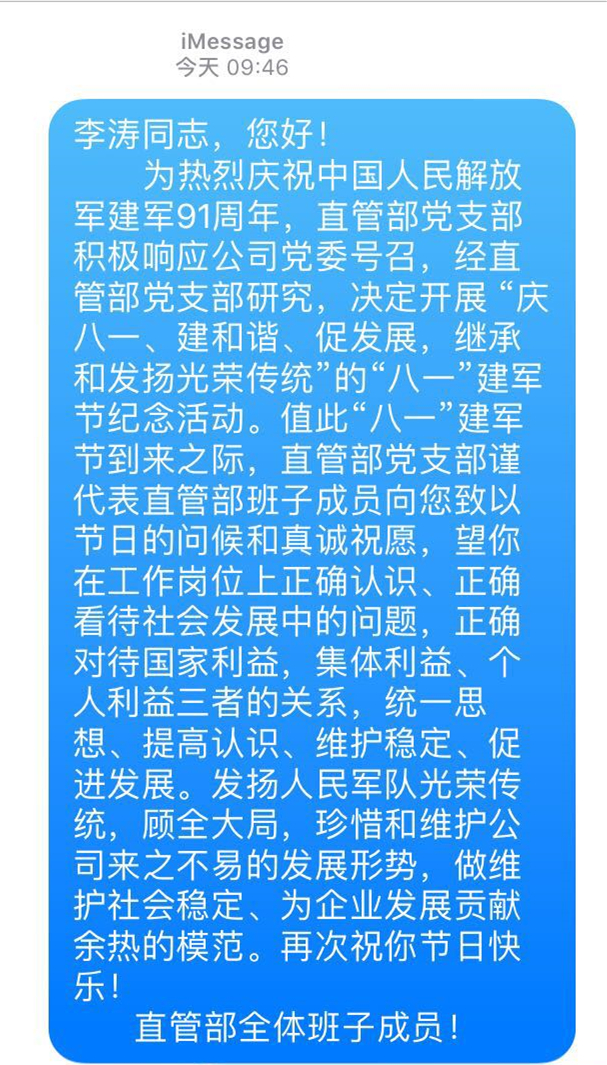 8月1日,第四直管項(xiàng)目部黨支部積極響應(yīng)公司黨委號(hào)召,在直管部開展主題為“慶八一、建和諧、促發(fā)展,繼承和發(fā)揚(yáng)光榮傳統(tǒng)”的“八一”建軍節(jié)紀(jì)念活動(dòng)。 在“八一”建軍節(jié)到來(lái)之際,直管部黨支部書記陳德正代表黨支部和直管部領(lǐng)導(dǎo)班子向兩名復(fù)退轉(zhuǎn)崗軍人發(fā)送了慰問(wèn)短信,并以電話的方式再次向他們表達(dá)節(jié)日的祝福和問(wèn)候。望他們?cè)诠ぷ鲘徫簧险_認(rèn)識(shí)、正確看待社會(huì)發(fā)展中的問(wèn)題,正確對(duì)待國(guó)家利...