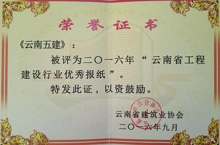 9月21日,云南省建筑業(yè)協(xié)會發(fā)布了《關(guān)于對2016年度云南省工程建設(shè)行業(yè)優(yōu)秀期刊、報紙的表彰決定》(云建協(xié)[2016]32號)。公司《云南五建》報獲評“云南省工程建設(shè)行業(yè)優(yōu)秀報紙”。 《云南五建》報自2011年1月開辦,至2016年9月共發(fā)行69期,常規(guī)分為4個版面,內(nèi)容涉及公司新聞、管理動態(tài)、工程動態(tài)、教育培訓(xùn)、安全生產(chǎn)...