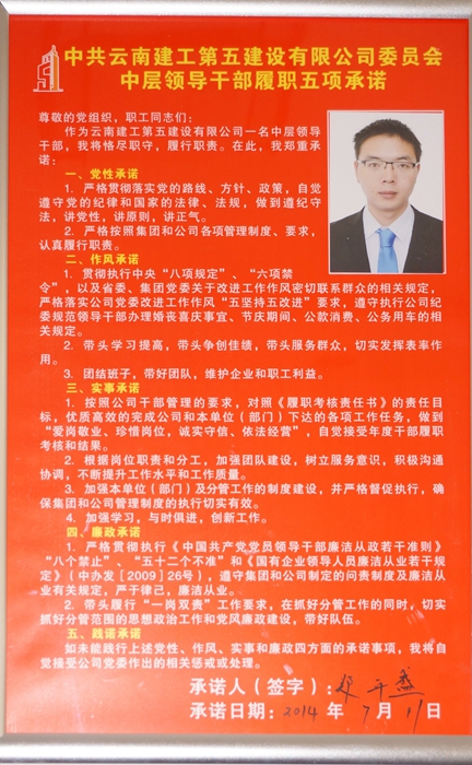 “尊敬的黨組織,職工同志們:作為云南建工第五建設有限公司一名中層領導干部,我將恪盡職守,履行職責。在此,我鄭重承諾:……”近日,公司中層以上領導干部均在各自辦公室醒目位置掛牌公示《中層領導干部履職五項承諾》。 早在今年5月初,為加強對中層干部的管理,強化監(jiān)督,落實責任,促進干部履職。公司紀檢監(jiān)察部聯(lián)合黨委工作部制定《中層領...
