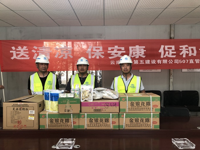 • 隨著夏季的到來(lái),各地氣溫逐漸升高,五〇七直管項(xiàng)目部工會(huì)主席畢鵬,帶著滿滿一車解暑、防蚊蟲(chóng)、清熱解毒的物品趕赴項(xiàng)目施工一線,逐一慰問(wèn)一線項(xiàng)目職工。 六月,畢鵬分別到2018年五華區(qū)C級(jí)不安全校舍重建項(xiàng)目、鎮(zhèn)雄縣第二人民醫(yī)院項(xiàng)目、大關(guān)縣翠華鎮(zhèn)中學(xué)項(xiàng)目進(jìn)行“送清涼”慰問(wèn),為項(xiàng)目一線職工們送去了菊花茶、十滴水、金銀花露、驅(qū)蚊藥水等物品。炎熱的夏季…