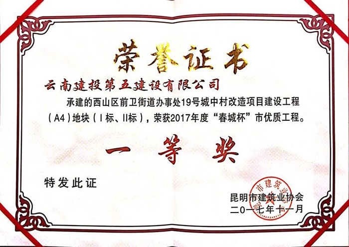 直五部潤城19#地塊項(xiàng)目喜獲“春城杯”優(yōu)質(zhì)工程獎