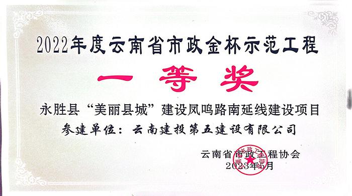 永勝縣“美麗縣城”建設(shè)鳳鳴路南延線建設(shè)項(xiàng)目榮獲2022年度云南省市政金杯示范工程一等獎(jiǎng)