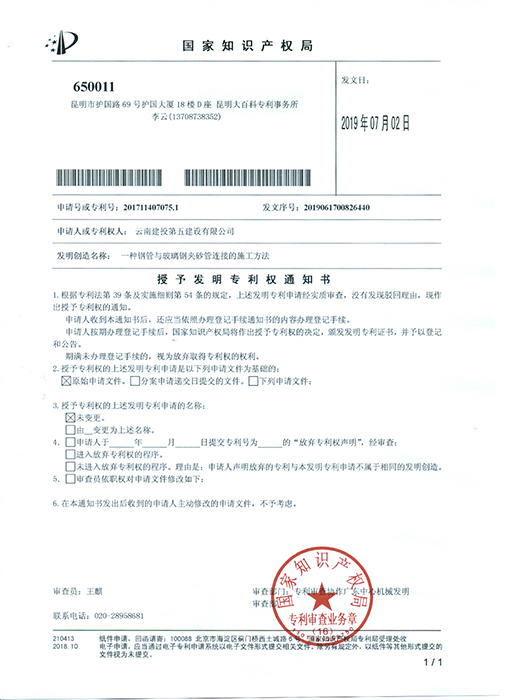 近日,公司《一種鋼管與水泥預制管連接的施工方法》與《一種鋼管與玻璃鋼夾砂管連接的施工方法》兩項技術成果榮獲國家發(fā)明專利授權。 兩個發(fā)明專利由路橋二部在公司技術中心等相關部門的指導下完成,項目部依托昆明市第十四污水處理廠自來水管道遷改工程,在管道遷改接點施工時,發(fā)現(xiàn)遷改管道采用鋼管與水泥管、玻璃鋼夾砂管不同管材的管道連接,不同管材連接施工技術措施在國內(nèi)外尚不成熟,且施工操作比較困…