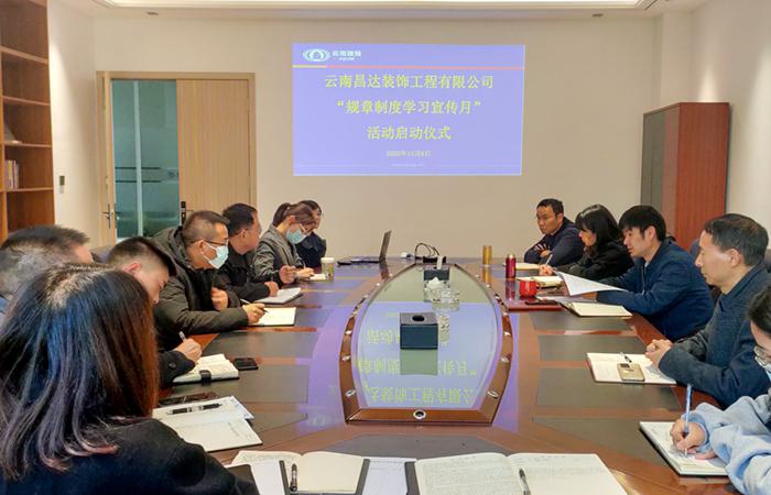 12月6日上午,云南昌達(dá)裝飾工程有限公司黨支部書記主持召開規(guī)章制度學(xué)習(xí)宣傳月啟動儀式,昌達(dá)公司領(lǐng)導(dǎo)班子成員、部門負(fù)責(zé)人、項目經(jīng)理15人參加?!耙?guī)章制度學(xué)習(xí)宣傳月”活動,以今年公司下發(fā)更新的各項規(guī)章制度為主要學(xué)習(xí)內(nèi)容。昌達(dá)公司領(lǐng)導(dǎo)班子和各部門按照經(jīng)濟(jì)管控、物資設(shè)備管理、施工管理、人力資源管理、資金管理、綜合業(yè)務(wù)管理等方面牽頭組織全體職工在12月內(nèi)分板塊開展集中學(xué)習(xí)。通過抓宣傳、抓培訓(xùn)、抓交流、抓整治…